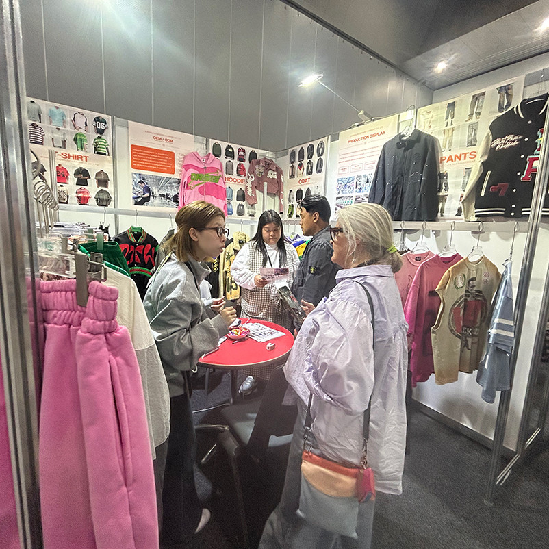 The bold color combinations, graphic prints, varsity aesthetics, and premium fabrics drew continuous interest from buyers. Many visitors stopped to examine product details, praising our craftsmanship and high production stability.